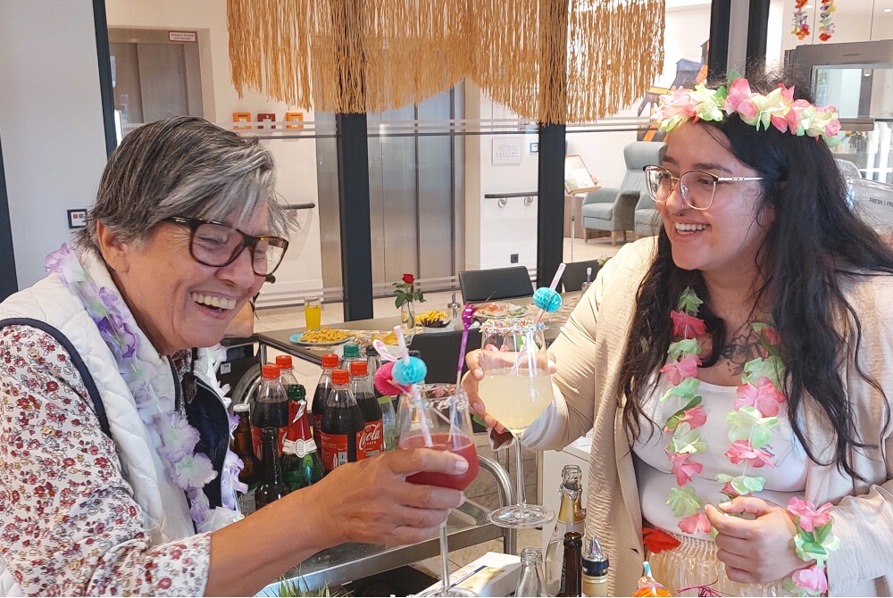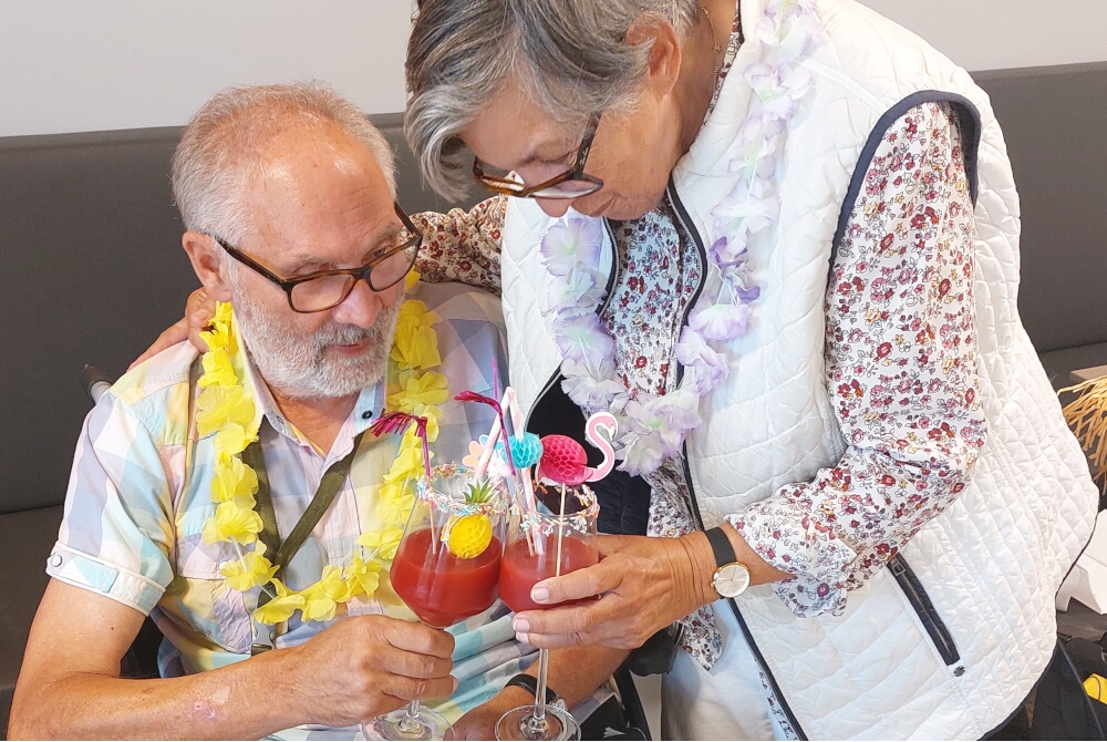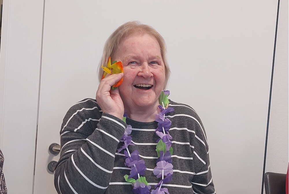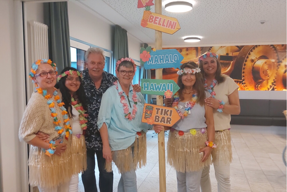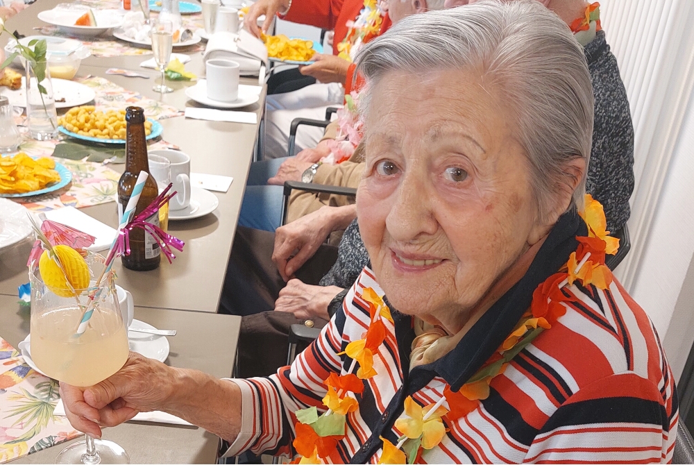 Zur Einstimmung hingen sich die Bewohnerinnen und Bewohner bunte Blumenketten um: So eröffnet begann das Fest im liebevoll und passend vom Betreuungsteam dekorierten Restaurant der Einrichtung. Dazu bediente sich, wer wollte, an farbenfrohen Accessoires wie Brillen oder Kränzen und gönnte sich einen geschmückten Cocktail oder Leckereien. Dafür sorgte die Küche, die unter anderem Toast Hawaii und fruchtige Obstspieße servierte.