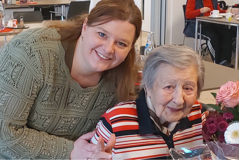 Geschenke für Zentenarin: Die Mitarbeitenden der Residenz hatten es sich nicht nehmen lassen und hatten ihr ein Ständchen gebracht. Dazu hatten sie eine eigens gestaltete Karte und einen Blumenstrauß überreicht: Herzlichen Glückwunsch zum einhundertsten Ehrentag. Wir haben uns sehr gefreut, gemeinsam zu feiern und wünschen noch weitere Lebensjahre!