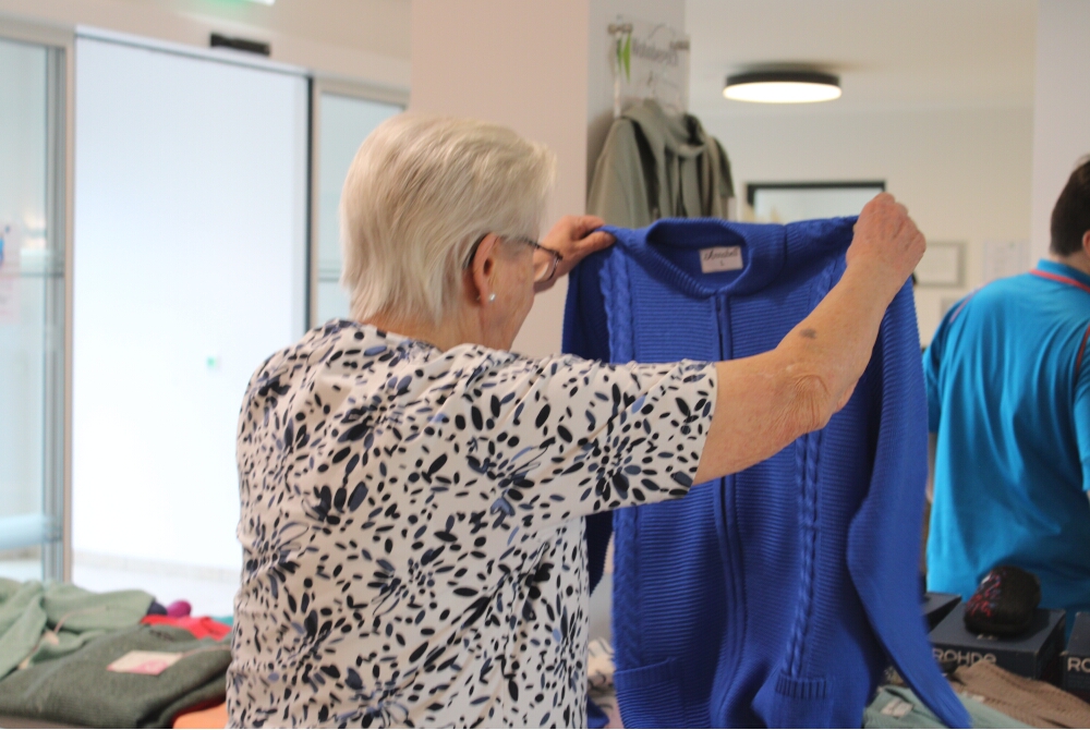 Neues entdecken und genau begutachten: Nach der Fashionshow hatten alle Teilnehmenden die Möglichkeit, die Kleidung anzusehen, anzuprobieren – und wenn sie ihnen gefiel, zu kaufen. Dabei hatten sie die Mitarbeitenden des Betreuungsdienstes begleitet und bei der Anprobe unterstützt. Die Bewohnerinnen und Bewohnen hatten nach dem gelungenen Nachmittag geäußert, dass sie viel Spaß hatten, und einige nennen nun ein neues Kleidungsstück ihr Eigen.