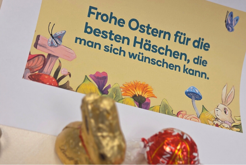 Süße Botschaft und kleine Nascherei: Während der Blitzrunde – einer Besprechung der Mitarbeiterinnen und Mitarbeiter – hatten alle zahlreiche Säckchen mit einem lieben Ostergruß und Schokolade entdeckt. Dazu hatten sie den Spruch gelesen: „Frohe Ostern für die besten Häschen, die man sich wünschen kann.“