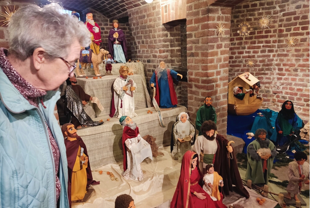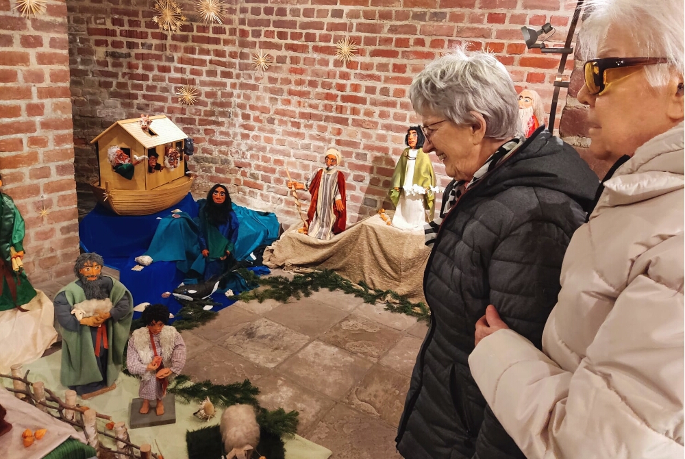 Herzlicher Empfang im Kloster: Die Ordensschwestern hatten die Besuchergruppe hilfsbereit begrüßt und die waren mit dem Fahrstuhl ins Kellergewölbe zur dort aufgestellten Krippe gefahren. Unten angekommen, kamen die Seniorinnen und Senioren nicht mehr aus dem Staunen heraus. Immer wieder waren ihre Blicke an den detailreichen und farbenprächtigen Figuren mit beachtlicher Größe hängen geblieben.