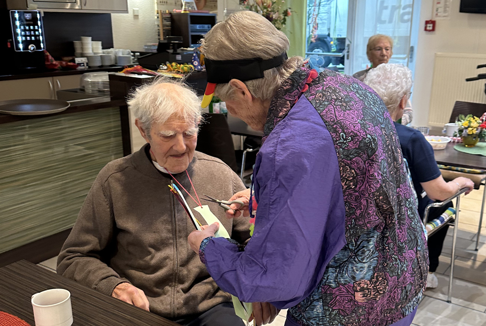 Besonders eine bewies echtes Geschick an der Klinge: Bewohnerin Gertrud Schulz fackelte nicht lange und kürzte die – vorsorglich vom Betreuungsteam präparierten – Schlipse der Herren fachgerecht ein. Die Männer nahmen es mit viel Humor und ernteten dafür Applaus. Danach ging die Beutejagd in den Wohnbereichen weiter – keine Krawatte war vor den Damen sicher.