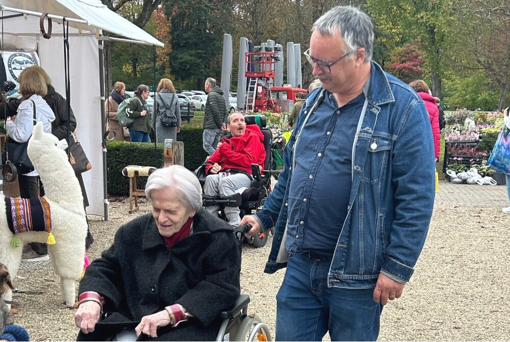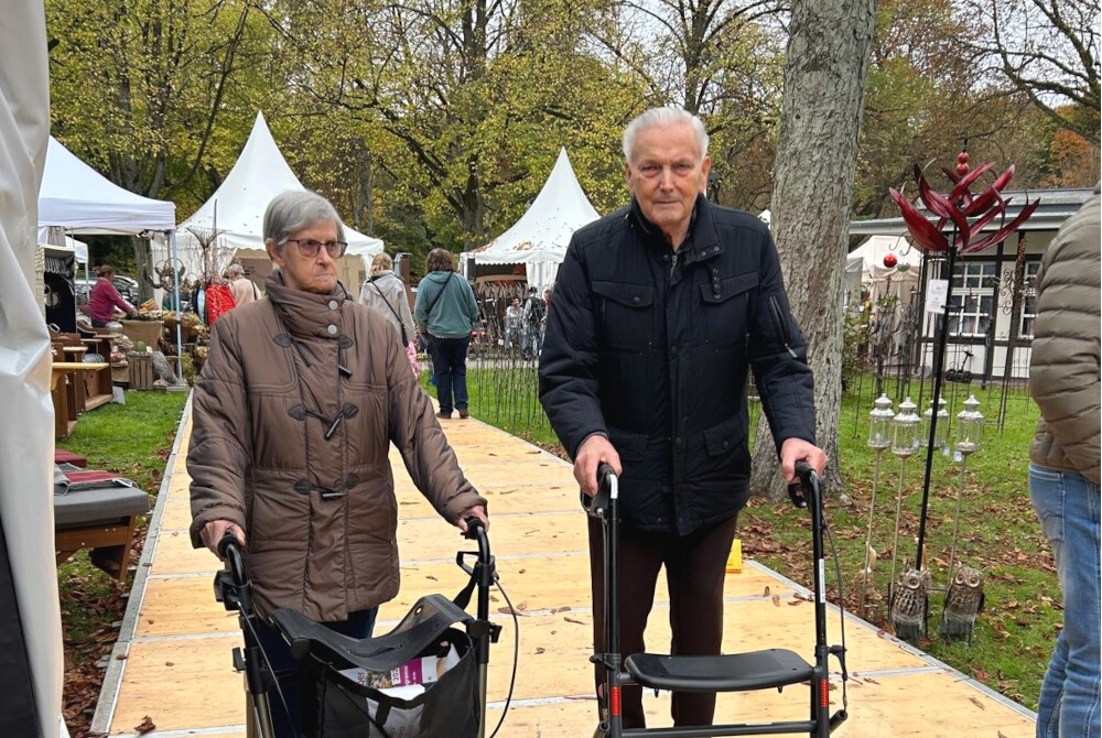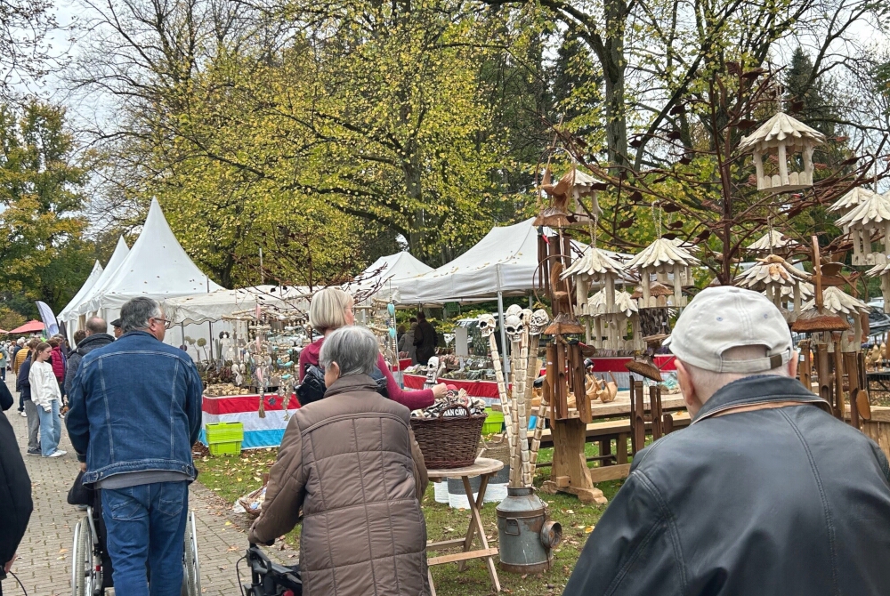 Die Jugendstilarchitektur beeindruckt immer wieder im herbstlichen Flair: Gut gelaunt flanierte die Gruppe über das Gelände und bestaunte rund 160 Ausstellende und deren Waren. Die präsentierten an ihren Ständen eine bunte Mischung aus Pflanzen, Gartenmöbeln, Mode und köstlichen Spezialitäten. Letzteres probierten die Seniorinnen und Senioren selbstverständlich, unter anderem Käse aus Italien, Schinken aus Österreich und Nüsse sowie Dips. Während sie eingelegte Tomaten und Oliven verkosteten, trafen sie auf Jürgen Bürgers und sagten: „Vielen herzlichen Dank für die Einladung.“