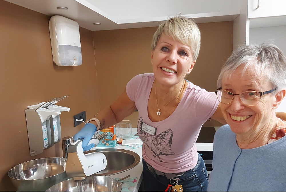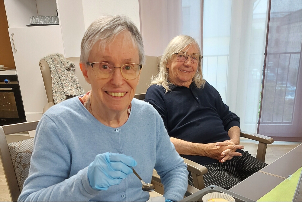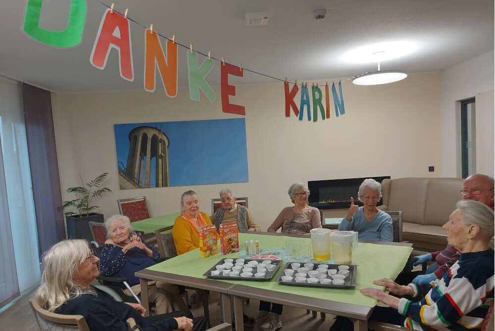 Süße Überraschung am Nachmittag: Die Bewohnerinnen und Bewohner wollten zusammen mit den Mitarbeitenden des Betreuungsdienstes „Danke Karin“ sagen und so ihre Wertschätzung zeigen. Morgens buken sie dazu frische Muffins, mit denen sie später Karin Schomisch überraschten. Die liebe Aktion kam bei ihr an und gemeinsam ließen sie sich die Leckerei mit Kaffee in gemütlicher Runde schmecken.